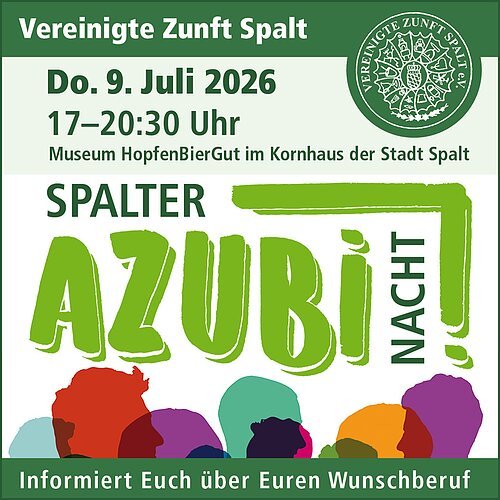 Die Initiative der Vereinigten Zunft – Spalter Azubi-Nacht – wird sehr gerne von der Stadt Spalt unterstützt. Im Kornhaus Museum HopfenBierGut belegen viele Betriebe das ganze Haus und bieten viele interessante Berufsangebote an. Eingeladen ist die ganze Familie, da sowohl für Eltern, die Schülerinnen und Schüler, als auch für alle Interessierten schöne Angebote zur Verfügung stehen.