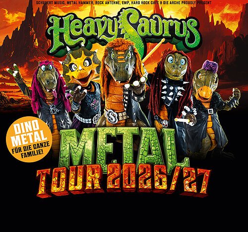 Vom Kinderzimmer bis aufs legendäre Wacken Open Air, vom Familienausflug bis zur Festivalbühne, von kleinen Clubs bis zu großen Hallen – HEAVYSAURUS spielen echten Metal für Groß und Klein. Vier Dinosaurier und ein Drache rocken die Bühnen mit einer Show, die Kinder wie Erwachsene gleichermaßen die „Pommesgabel“ recken lässt. Am 30.01.2026 erscheint das neue Album „METAL“ mit 15 brandneuen Songs. Anschließend gehen die fünf grüngeschuppten Helden mit der METAL Tour 2026/27 auf große Konzertreise, mit neuen Songs, neuer Show und altbewährter Dino-Power!