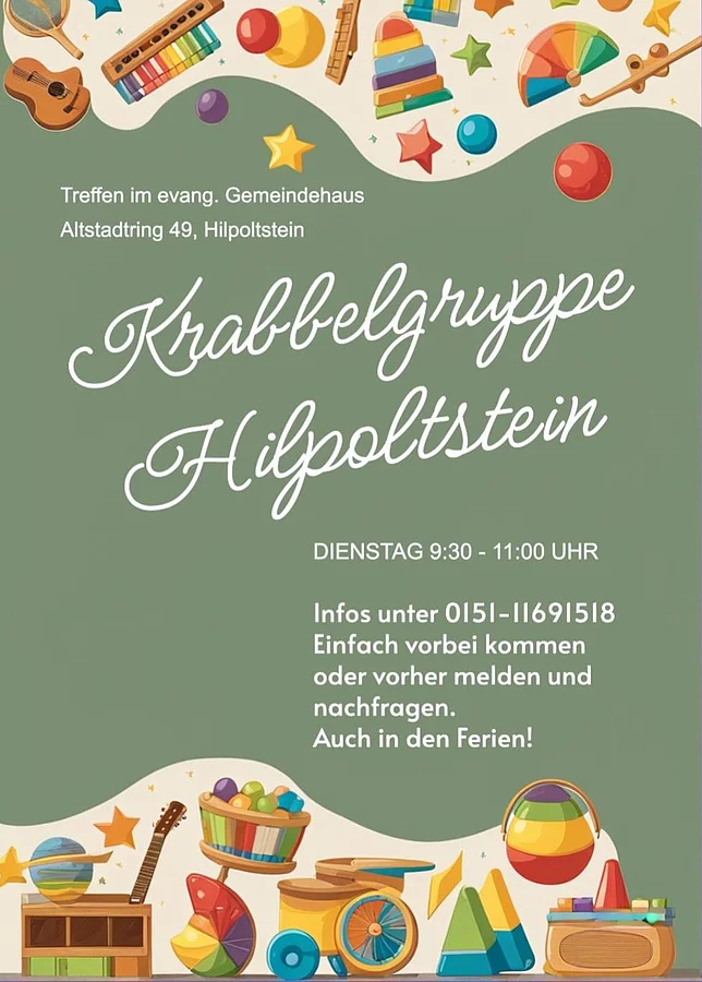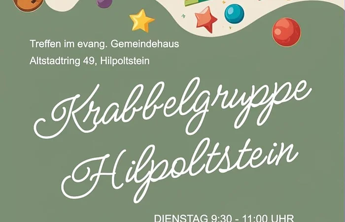 Eine Gruppe von Eltern mit Kindern im Alter von 0 Monaten bis 3 Jahren. Es wird gesungen und gemeinsam gespielt. Einmal im Monat gibt es ein gemeinsames Frühstück mit Austauschen in einem Café in Hilpoltstein. Außerdem werden passend zur Jahreszeit regelmäßig Ausflüge oder Angebote wie Faschingsfeier oder St. Martinsumzug organisiert. Natürlich steht der Spaß hoch im Kurs und jedes Kind darf seinen Geburtstag angemessen feiern. Einmal im Jahr wird außerdem ein Babybasar organisiert. Kinder zwischen 0 und 3 Jahren sind herzlich willkommen. Einfach vorbeischauen. Die Krabbelgruppe trifft sich jeden Dienstag im evangelischen Gemeindehaus am Altstadtring 49. Auch in den Schulferien.