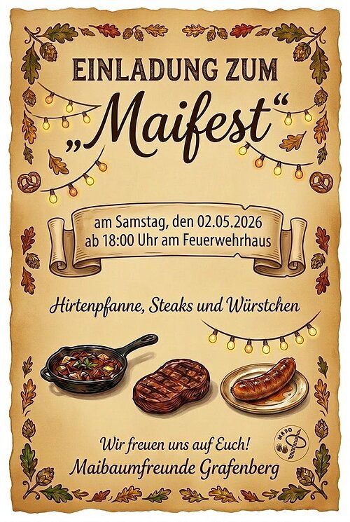 Einladung zum Maifest am Samstag, den 2. Mai 2026 ab 18.00 Uhr am Feuerwehrhaus.