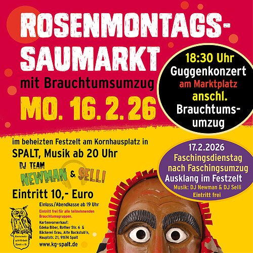 Am Rosenmontag erwartet Sie um 18:30 Uhr ein Guggenkonzert am Marktplatz auf der Bühne mit anschließenden Brauchtums-Umzug durch die Altstadt. Dieser verläuft durch die historische Altstadt und endet am Kornhausplatz mit dem Einzug zum Rosenmontag-Saumarkt-Ball im beheizten Festzelt mit „DJ-Team Newman & Selli“.